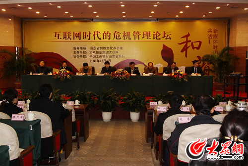 大眾網(wǎng)泰安12月3日訊(記者 李冉 陳宏發(fā) 吳哲 劉國棟 趙新婷)當今網(wǎng)絡世界,危機事件頻發(fā)。如何應對由此引發(fā)的網(wǎng)絡傳播效應,以最快、最佳的方式解決問題,向公眾傳遞事實信息,進行網(wǎng)絡輿論危機管理,塑造良好形象?今天上午9:30,由大眾網(wǎng)主辦的 “互聯(lián)網(wǎng)時代的危機管理論壇”在泰山腳下召開。來自全省十七市網(wǎng)絡文化工作者及各行業(yè)的企業(yè)代表近百人參與本次論壇,共同探討網(wǎng)絡危機管理。