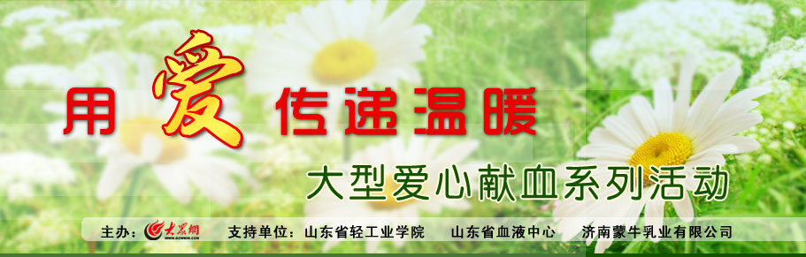 血液是生命之源,生活中每時(shí)每刻都有人需要血液。在沒(méi)有替代品的今天,臨床用血只能來(lái)自健康人自愿捐獻(xiàn)。每年我省臨床用血量以超過(guò)10%的速度快速增長(zhǎng)。而秋冬季節(jié)卻是血液采集的淡季。病床上無(wú)數(shù)生命正在期待血液的救治!為幫助更多的人度過(guò)生命難關(guān),大眾網(wǎng)聯(lián)手山東輕工業(yè)學(xué)院、山東省血液中心及蒙牛公司共同發(fā)起“用愛(ài)傳遞溫暖——大型校園愛(ài)心獻(xiàn)血活動(dòng)”,呼吁愛(ài)心人士加入其中。