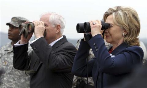 克林頓國務(wù)卿和蓋茨部長在板門店非軍事區(qū)觀測對面朝鮮