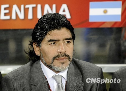 圖為馬拉多納專注觀戰(zhàn)。北京時(shí)間6月28日凌晨,第19屆世界杯一場1/8決賽在約翰內(nèi)斯堡的足球城球場展開爭奪,阿根廷3比1擊敗墨西哥,將在1/4決賽對(duì)陣德國。 中新社發(fā) 廖攀 攝