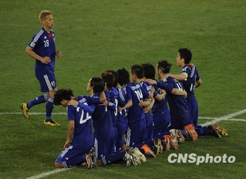 6月29日晚,南非世界杯1/8決賽第七場比賽在比勒陀利亞的洛夫托斯球場拉開戰(zhàn)幕,由巴拉圭隊迎戰(zhàn)日本隊。120分鐘比賽結(jié)束時,場上比分始終保持在0比0。在殘酷的點球大戰(zhàn)中,巴拉圭隊五罰全中,以5-3擊敗日本,挺進八強。圖為點球大戰(zhàn)中日本隊員集體下跪祈求上蒼。 中新社發(fā) 廖攀 攝