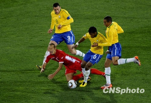 當(dāng)?shù)貢r間6月15日晚,南非世界杯G組小組賽巴西對陣朝鮮的焦點戰(zhàn)在約翰內(nèi)斯堡舉行,朝鮮前鋒9號鄭大世在比賽爭奪時摔倒。鄭大世現(xiàn)在日本川崎前鋒隊踢球。和其他土生土長的朝鮮隊員不同,鄭大世出生在日本名古屋。他從小就就讀于“在日本朝鮮人總聯(lián)合會”下屬學(xué)校。 中新社發(fā) 廖攀 攝