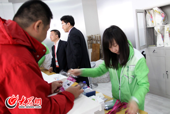 工作人員正在向一位記者派發(fā)證件。