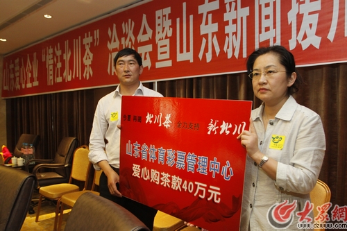 山東省體育彩票管理中心宣傳部部長何珊代表山東愛心企業(yè)發(fā)言時說,了解到山東媒體發(fā)起的“今夏請喝北川茶”活動后,山東省體育彩票管理中心及工作在一線的廣大體彩投注站站長積極響應(yīng),踴躍認(rèn)購北川茶,短時間確定購買40萬元的茶葉。她說,此次來北川,他們帶來了山東體彩人對災(zāi)區(qū)的問候,表達(dá)了山東省體育彩票管理中心和體彩人對支持災(zāi)區(qū)重建的一份心情。