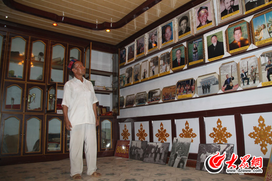 跟著老人抬腿邁進(jìn)去,突然燈打開了,這間十平米左右的屋子三面墻上赫然掛滿了幾十張各個(gè)時(shí)代的木卡姆傳人的照片,西邊則全是櫥柜,里面全是老人的獎(jiǎng)牌和獎(jiǎng)杯,以及木卡姆的樂器、曲譜。這里就是吐爾遜·司馬義老人自己的木卡姆家庭博物館了。