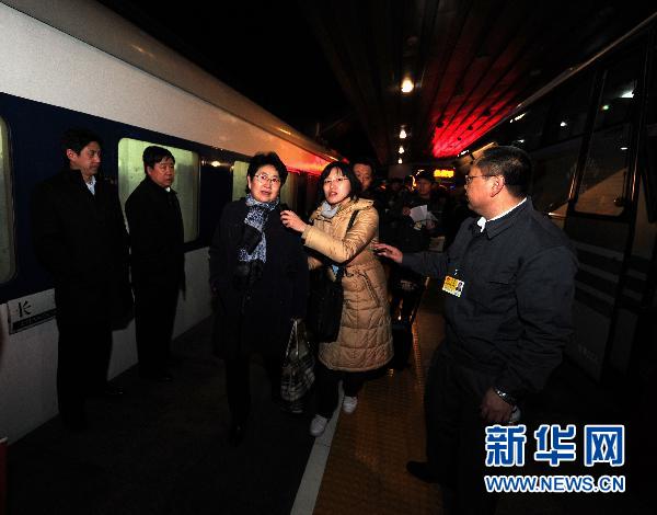3月1日6時,來自吉林的全國政協(xié)委員乘坐Z62次列車抵達北京站,這是首批抵京參加全國政協(xié)十一屆四次會議的京外委員。圖為遲寶榮委員(左三)在出站間隙接受采訪。新華社記者 張鐸 攝