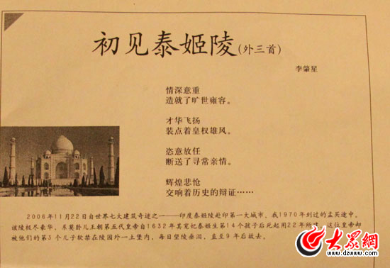 “得送你們點東西!庇捎跁r間關系,剛聊了一會兒,李肇星就著急離開。臨行前,他打開隨身的公文包,將自己寫的詩《初見泰姬陵》,以及一本《世界知識》雜志送給了大眾網(wǎng)記者。