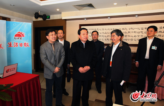 3月11日上午,山東省委常委、宣傳部長孫守剛來到大眾報業(yè)集團“兩報一網”直播室看望慰問新聞工作者。 (特派記者 曹亮 攝)