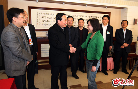 大眾網北京3月11日訊(記者 馮煒程 曹亮 盛堃)11日上午,山東省委常委、宣傳部長孫守剛在省委宣傳部副部長徐向紅,省人大常委會研究室主任楊思誠,省廣電局局長劉長允,省委宣傳部副巡視員王世農等陪同下,在北京親切看望慰問報道全國“兩會”的山東新聞工作者。孫守剛聽取了山東各媒體“兩會”期間的工作情況介紹,對山東媒體全國“兩會”報道給予充分肯定。他還對大眾網在兩會期間推出的“請問省長”、“請問書記、市長”等欄目以及山東的全國人大代表利用眾眾微博為網友解決實際問題給予高度評價。
