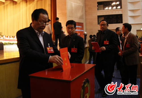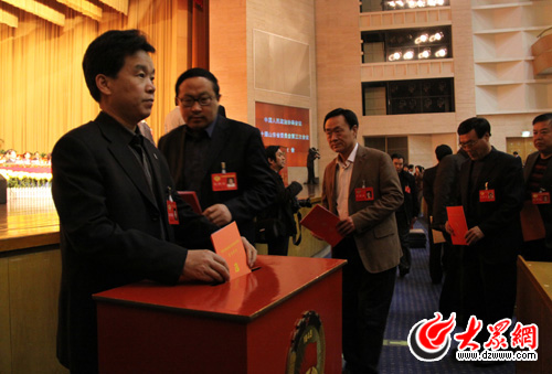 山東省政協(xié)十屆三次會(huì)議今天閉幕。圖為選舉大會(huì)現(xiàn)場(chǎng),政協(xié)委員進(jìn)行投票。