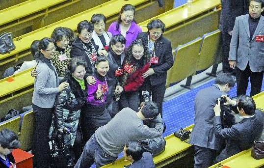 山東省政協(xié)十屆四次會(huì)議于2月16日上午閉幕。圖為閉幕大會(huì)間隙,幾位女委員正在會(huì)場(chǎng)合影留念。 本報(bào)記者 王媛 攝