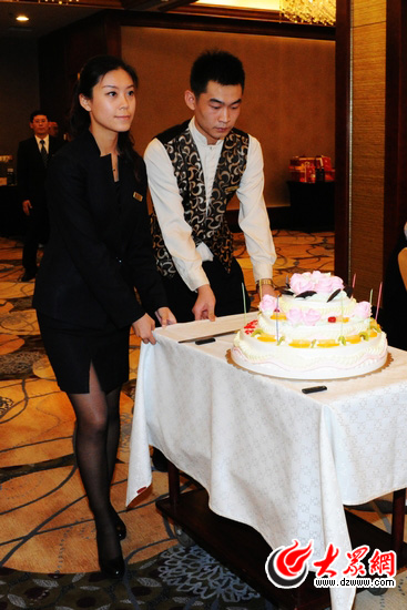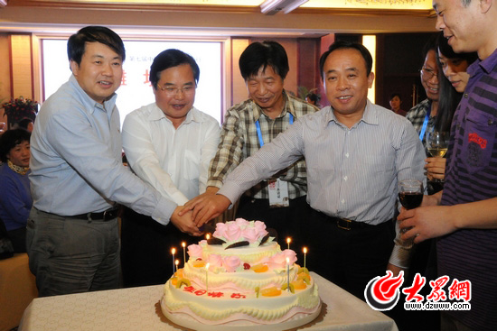 “熟悉的旋律又響起來了,每一年,這個(gè)旋律是我們的家人和朋友為我們過生日而準(zhǔn)備的,今天,許多朋友因?yàn)椴稍L而無法和家人團(tuán)聚,我們?yōu)檫^這些朋友準(zhǔn)備了生日蛋糕,讓大家共同分享他們的快樂!”今晚8時(shí),大眾網(wǎng)總編輯朱德泉手持話筒,出現(xiàn)在了宴會廳的中央,他一一念出10位壽星的名字,在10月份過生日的團(tuán)員們欣喜地走上前來,接受這份意外的祝福。生日蠟燭搖曳著,熱烈的掌聲此起彼伏,濰坊市委書記、市人大常委會主任張新起,山東省網(wǎng)絡(luò)文化辦公室主任劉致福,濰坊市委常委、宣傳部部長初寶杰和壽星們一起切開了生日蛋糕。