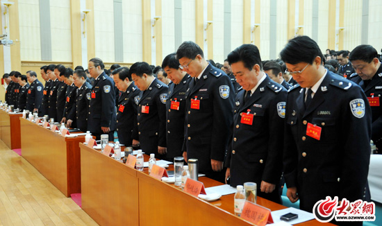 在1月7日召開的全省公安工作會(huì)議上,省長助理、省公安廳廳長吳鵬飛和全體與會(huì)代表為在泰安“1.04”持槍殺人案中犧牲的三名民警和一名協(xié)勤默哀,悼念英雄,表達(dá)哀思。(陳進(jìn) 劉冠偉 曹亮)