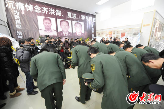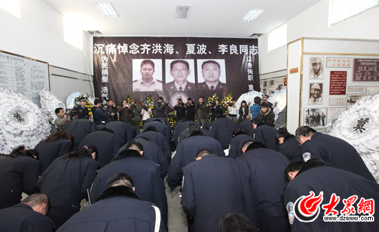 潔白的花圈在寒風(fēng)中簌簌作響,“沉痛悼念英勇犧牲的戰(zhàn)友”黑字挽聯(lián)格外醒目,烈士陵園廣場數(shù)百名民警整齊列隊。脫帽,肅立,默哀,“今天我們懷著十分悲痛的心情來悼念親愛的戰(zhàn)友,齊洪海同志、夏波同志和李良同志,他們用鮮血和生命實(shí)踐了人民警察對黨、對人民的莊重誓言,體現(xiàn)了人民警察對黨、對人民的堅定信念,是全體民警學(xué)習(xí)的榜樣!背林、深情的悼詞之后,民警開始按順序緩步走進(jìn)革命史展館公祭堂。