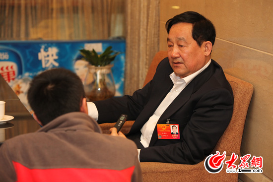 全國人大代表、淄博市周村區(qū)永安街街道辦事處燈塔民族村黨支部書記劉榮喜接受大眾網(wǎng)記者采訪。