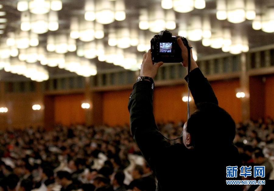 3月11日,全國(guó)政協(xié)十一屆五次會(huì)議在北京人民大會(huì)堂舉行第四次全體會(huì)議。這是一名記者在會(huì)場(chǎng)采訪。 新華社記者 蘭紅光 攝