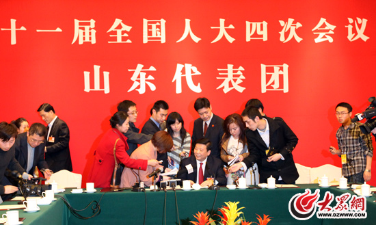 [提要] 山東團(tuán)開放日上,全國(guó)人大代表、山東省委副書記、省長(zhǎng)姜大明對(duì)大眾網(wǎng)記者說(shuō):“網(wǎng)友有疑問我們進(jìn)行回答,去年你拉出個(gè)單子(網(wǎng)友提問),我做了回答,今年你提的早,我已經(jīng)回答完了交給你了!笔¢L(zhǎng)的話音剛落,現(xiàn)場(chǎng)隨即響起一片會(huì)意的笑聲。