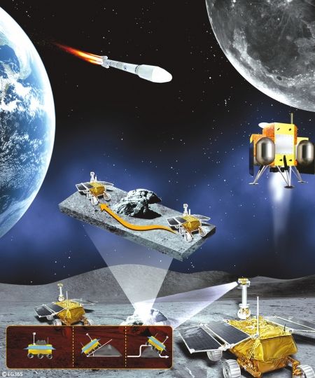 探月工程三期,月球車將對月壤采樣,然后裝回儲藏器,在無人的情況下在月球表面發(fā)射小火箭,并在月球軌道實(shí)現(xiàn)空間對接,最終將月壤樣品帶回地球
