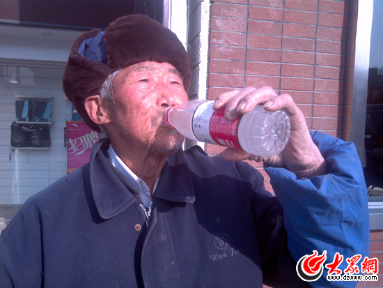 老人從家里帶來的水已經(jīng)冰涼了,但依然能解渴。(韋輝 攝)