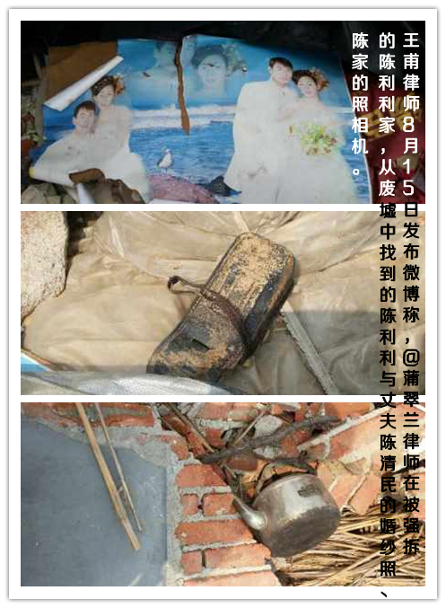 8月15日11:11,@王甫律師上傳了陳利利家房屋被拆后的場景圖片,稱:“@浦翠蘭律師在被強拆的陳利利家,他手持從廢墟中找到的陳利利與丈夫陳清民的婚紗照、陳家的照相機……”后附多張照片顯示,廢墟中有一個沒有受損的鐵水壺和一張被撕成兩半的婚紗照。