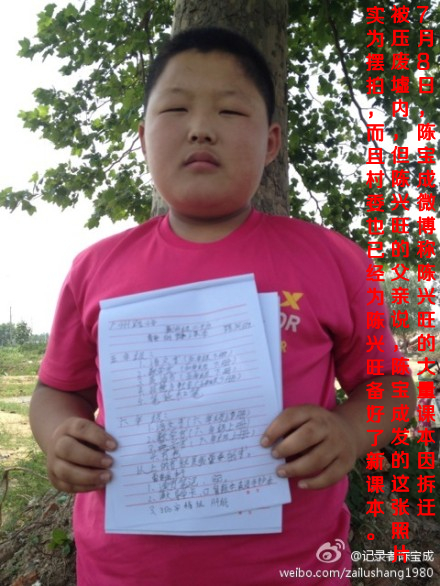 7月8日,陳寶成微博稱陳興旺的大量課本因拆遷被壓廢墟內,但陳興旺的父親說,陳寶成發(fā)的這張照片實為擺拍,而且村委也已經為陳興旺備好了新課本。