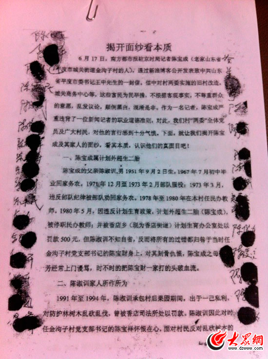金溝子村村委委員陳廣澤對大眾網(wǎng)記者說,2011年6月份,村委召開黨員、村民代表大會,78名黨員、村民代表一致聯(lián)名書寫《揭開面紗看本質(zhì)》,揭露陳寶成“顛倒黑白”行為,并在該篇文章上簽名、并按手印。