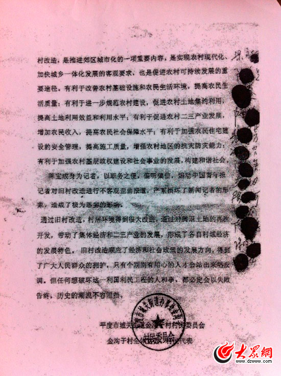 談到村里因陳寶成阻撓拆遷而造成的損失,陳衛(wèi)生在此前接受采訪時說,2012年,由平度市帶隊到上海為金溝子村招商,一家上海的酒店經(jīng)過區(qū)位等要素的考察,基本同意出資建設(shè)高檔酒店,并由金溝子村以土地入股的形式參與分紅。但就在資金即將到位的時候,上?偛恳浴霸摯宕嬖跐撛诿,可能會影響資金安全”為由拒絕向金溝子村投資。三年來,多個招商項目因為村里有拒拆戶而泡湯,陳衛(wèi)生對此感到非常遺憾。