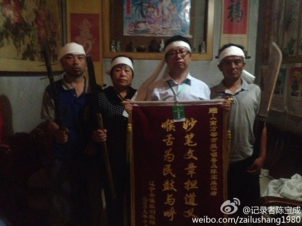 大眾網(wǎng)平度9月9日訊(記者 于瀟瀟 盛堃 李兆輝)7月6日,@記錄者陳寶成在其微博上曬出了一張陳寶成本人及三名村民的合影。在這張照片中,他們四人頭系白布、手拿大刀等武器,并稱“決戰(zhàn)!”。7月10日和8月9日,大眾網(wǎng)記者兩次采訪了照片中的金溝子村民陳海濤。陳海濤稱,他當(dāng)時(shí)并不知道這張照片被拿去做什么用,當(dāng)時(shí)自己只是拿起陳寶成準(zhǔn)備的“道具”配合拍照。
