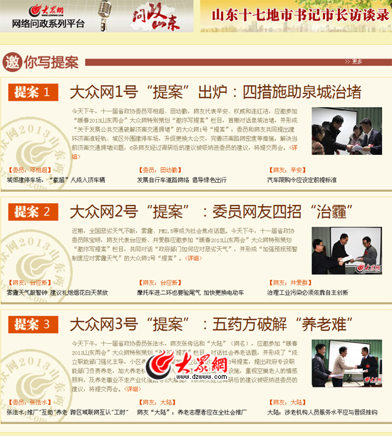 2013年省“兩會(huì)”,大眾網(wǎng)特別策劃推出網(wǎng)友互動(dòng)欄目——“邀你寫提案”。