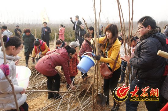 到達(dá)植樹現(xiàn)場(chǎng)后,大家依次領(lǐng)來(lái)工具和樹苗
