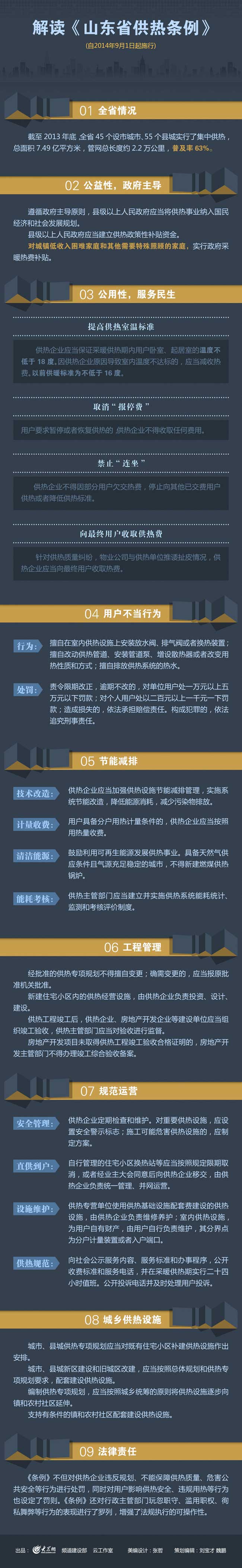 (五)突出規(guī)范運(yùn)營(yíng)行為,保障供熱安全穩(wěn)定運(yùn)行。一是加強(qiáng)供熱安全生產(chǎn)管理!稐l例》規(guī)定,發(fā)展供熱事業(yè)應(yīng)當(dāng)遵循保障安全的原則;供熱企業(yè)應(yīng)當(dāng)對(duì)其負(fù)責(zé)管理的供熱設(shè)施進(jìn)行定期檢查和維護(hù),保證其在使用期內(nèi)安全穩(wěn)定運(yùn)行;供熱企業(yè)應(yīng)當(dāng)建立健全安全生產(chǎn)責(zé)任制。對(duì)高溫高壓等重要供熱設(shè)施,應(yīng)當(dāng)按照規(guī)定設(shè)置明顯的安全警示標(biāo)志;建設(shè)工程施工可能危害供熱設(shè)施安全的,建設(shè)單位應(yīng)當(dāng)與供熱企業(yè)協(xié)商制定安全保護(hù)施工方案,并采取相應(yīng)的安全保護(hù)措施后方可施工!稐l例》還列出了六種危害供熱設(shè)施安全的禁止行為。二是推行供熱運(yùn)營(yíng)一體化直供到戶。供熱企業(yè)把熱賣給物業(yè)等中間機(jī)構(gòu),再由其轉(zhuǎn)賣給用戶,這些機(jī)構(gòu)往往缺少專業(yè)管理隊(duì)伍,供熱質(zhì)量難以保障,是產(chǎn)生矛盾糾紛的集中節(jié)點(diǎn)。《條例》規(guī)定,供熱企業(yè)應(yīng)當(dāng)實(shí)行熱源、管網(wǎng)、換熱站經(jīng)營(yíng)管理一體化,物業(yè)服務(wù)企業(yè)等單位自行管理的住宅小區(qū)換熱站等供熱經(jīng)營(yíng)設(shè)施應(yīng)當(dāng)按照規(guī)定限期取消,或者經(jīng)業(yè)主大會(huì)同意后向供熱企業(yè)移交,由供熱企業(yè)負(fù)責(zé)統(tǒng)一管理、并網(wǎng)運(yùn)營(yíng)。三是確立了供熱經(jīng)營(yíng)設(shè)施維護(hù)責(zé)任。與《山東省物業(yè)管理?xiàng)l例》相銜接,供熱專營(yíng)單位使用供熱基礎(chǔ)設(shè)施配套費(fèi)建設(shè)的供熱設(shè)施,由供熱企業(yè)負(fù)責(zé)維修養(yǎng)護(hù);室內(nèi)供熱設(shè)施,為用戶自有財(cái)產(chǎn),由用戶自行負(fù)責(zé)維護(hù),其分界點(diǎn)為分戶計(jì)量裝置或者入戶端口!稐l例》對(duì)此作了相應(yīng)規(guī)定。四是推行供熱規(guī)范化服務(wù)!稐l例》規(guī)定,供熱企業(yè)應(yīng)當(dāng)實(shí)行標(biāo)準(zhǔn)化管理和規(guī)范化服務(wù),向社會(huì)公示服務(wù)內(nèi)容、服務(wù)標(biāo)準(zhǔn)和辦事程序,公開收費(fèi)標(biāo)準(zhǔn)和服務(wù)電話,并在采暖供熱期實(shí)行二十四小時(shí)值班。供熱主管部門應(yīng)當(dāng)對(duì)供熱企業(yè)供熱質(zhì)量和服務(wù)質(zhì)量進(jìn)行監(jiān)督檢查和考核,公開投訴電話、信箱等,并及時(shí)處理用戶投訴。
