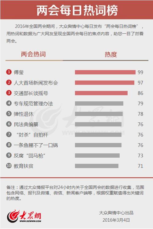 編者按:2016年全國(guó)兩會(huì)期間,大眾輿情中心每日發(fā)布“兩會(huì)每日熱詞榜”。通過大眾輿情平臺(tái)對(duì)24小時(shí)內(nèi)關(guān)于全國(guó)兩會(huì)的數(shù)據(jù)進(jìn)行收集,范圍包含網(wǎng)絡(luò)、報(bào)刊及微博、微信、新聞客戶端等,用熱詞和數(shù)據(jù)為廣大網(wǎng)友呈現(xiàn)全國(guó)兩會(huì)每天的熱點(diǎn)內(nèi)容,助您一目了然看兩會(huì)。