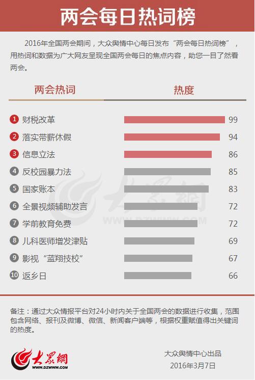 大眾網濟南3月7日訊(記者 劉欣王曉光 宋瑋瑋)今天,大眾輿情中心發(fā)布第六期“兩會每日熱詞榜”。“財稅改革”“落實帶薪休假”“信息立法”分別以99、94和86的熱度,成為今日最熱詞。
