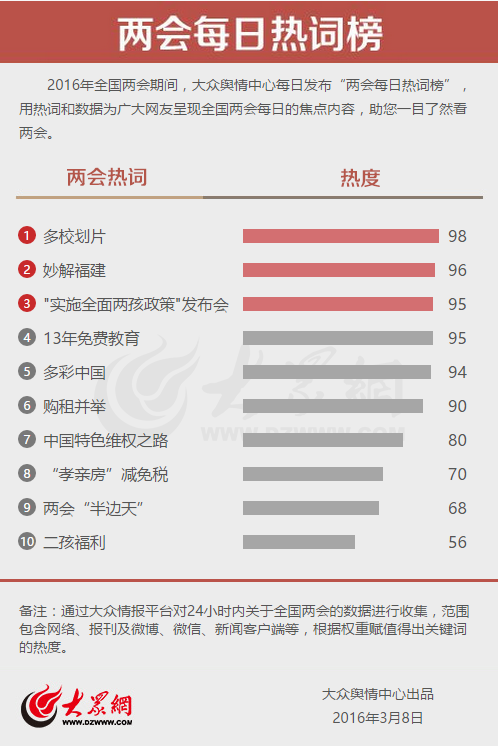 大眾網(wǎng)北京3月8日訊 (記者 劉欣 劉洪 宋瑋瑋)今天,大眾輿情中心發(fā)布第七期“兩會每日熱詞榜”。“多校劃片”“妙解福建”“‘實施全面兩孩政策’發(fā)布會”分別以98、96和95的熱度名列榜單三甲。