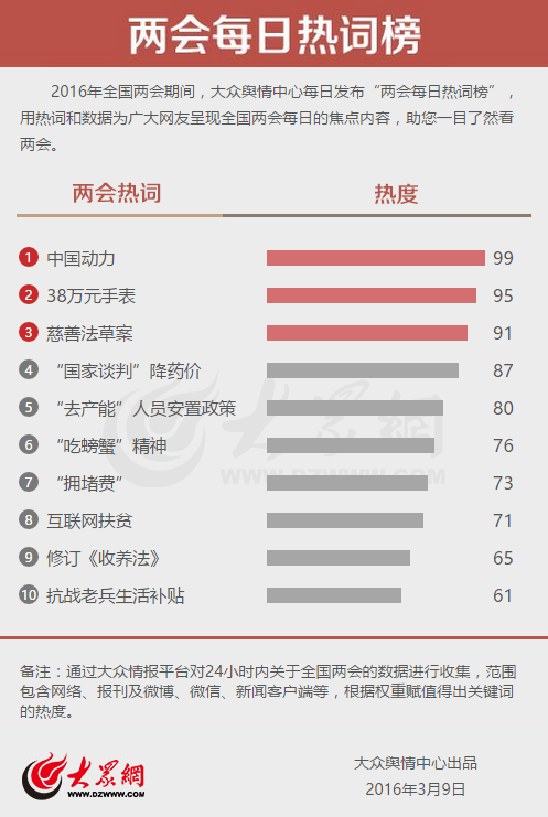 大眾網(wǎng)濟(jì)南3月9日訊(記者 宋瑋瑋 蘇桐)今天,大眾輿情中心發(fā)布第8期“兩會(huì)每日熱詞榜”!爸袊(guó)動(dòng)力”“38萬元手表”“慈善法草案”分別以99、95和91的熱度名列榜單三甲。