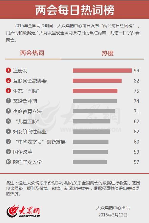大眾網(wǎng)3月12日訊 (記者 劉欣 劉洪 宋瑋瑋)今天,大眾輿情中心發(fā)布第十一期“兩會每日熱詞榜”。其中,“注冊制”和“互聯(lián)網(wǎng)金融協(xié)會”這兩個金融領(lǐng)域的熱詞分別以99、82的熱度位列前兩位!吧鷳B(tài)‘五喻’”、“兒童‘五防’”、“國企改革”等也成為今日熱詞。