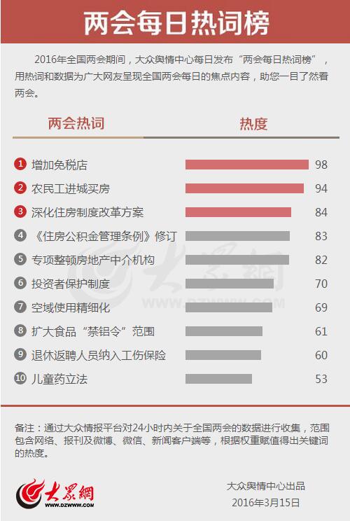 大眾網(wǎng)濟(jì)南3月15日訊(記者 王曉光 劉洪 宋瑋瑋 )今天,大眾輿情中心發(fā)布第十四期“兩會(huì)每日熱詞榜”。其中,消費(fèi)、房地產(chǎn)以及食品安全等領(lǐng)域的多個(gè)話題受到關(guān)注!霸黾用舛惖辍薄稗r(nóng)民工進(jìn)城買房”“深化住房制度改革方案”分別以98、94和84的熱度成為今日最熱詞。