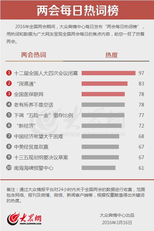 大眾網(wǎng)濟(jì)南3月16日訊(記者 王曉光 劉洪 宋瑋瑋)今天上午,第十二屆全國(guó)人民代表大會(huì)第四次會(huì)議圓滿完成各項(xiàng)議程,在人民大會(huì)堂勝利閉幕,本次大會(huì)審議并通過(guò)了十三五規(guī)劃綱要決議草案。在今天大眾輿情中心發(fā)布的第15期“兩會(huì)每日熱詞榜”上,“十二屆全國(guó)人大四次會(huì)議閉幕”“十三五規(guī)劃綱要決議草案”分別以97和67的熱度登上熱詞榜。