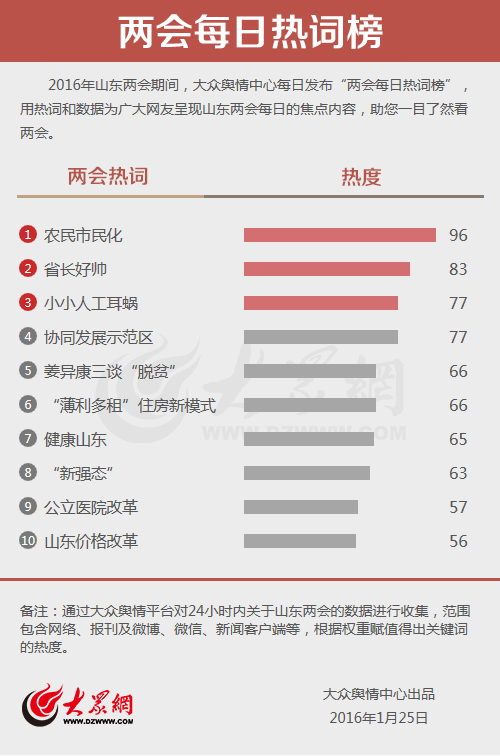 大眾網(wǎng)濟(jì)南1月25日訊(記者 劉欣 王曉光 宋瑋瑋)今天,大眾輿情中心發(fā)布第三期“兩會(huì)每日熱詞榜”。 “農(nóng)民市民化”“省長好帥”“小小人工耳蝸”分別以96、83和77的熱度名列熱詞榜前三。