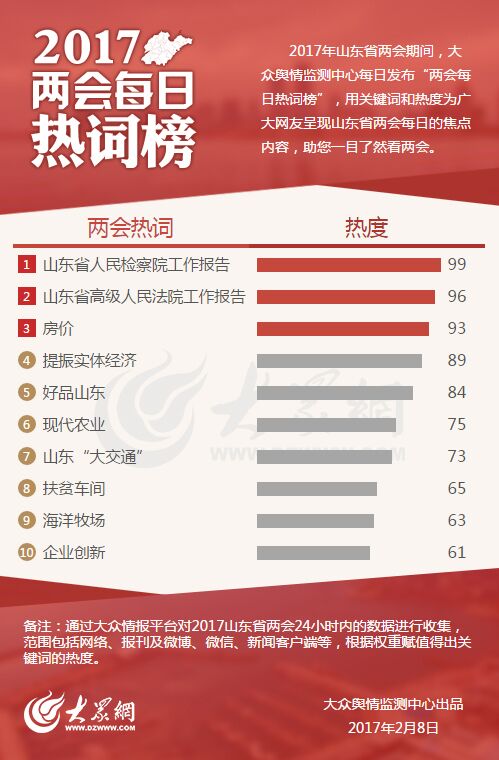 大眾網(wǎng)濟(jì)南2月8日訊 今天,大眾輿情監(jiān)測(cè)中心發(fā)布第四期“兩會(huì)每日熱詞榜”!吧綎|省人民檢察院工作報(bào)告”“山東省高級(jí)人民法院工作報(bào)告”和“房?jī)r(jià)”分別以99、96、93的熱度位居前三。