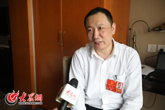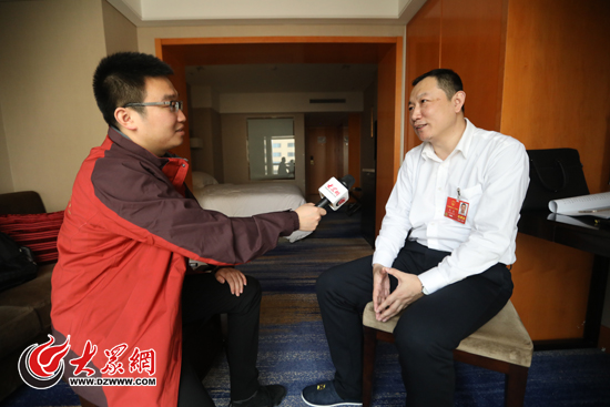 大眾網(wǎng)記者采訪全國(guó)人大代表、中國(guó)聯(lián)通濟(jì)南市分公司運(yùn)行維護(hù)部經(jīng)理馬波。(亓翔 攝)