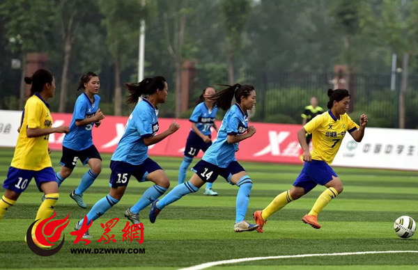 郯城一中女足隊(duì)員(身著黃色隊(duì)服)在比賽中。