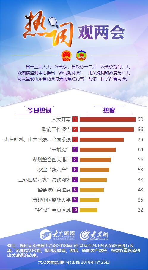 省十三屆人大一次會議、省政協(xié)十二屆一次會議期間,大眾輿情監(jiān)測中心推出“熱詞觀兩會”,用關(guān)鍵詞和熱度為廣大網(wǎng)友呈現(xiàn)山東省兩會每天的焦點內(nèi)容,助您一目了然看兩會。