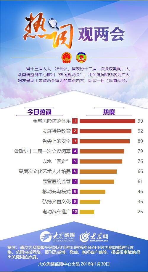 編者按:省十三屆人大一次會議、省政協(xié)十二屆一次會議期間,大眾輿情監(jiān)測中心推出“熱詞觀兩會”,用關鍵詞和熱度為廣大網友呈現(xiàn)山東省兩會每天的焦點內容,助您一目了然看兩會。