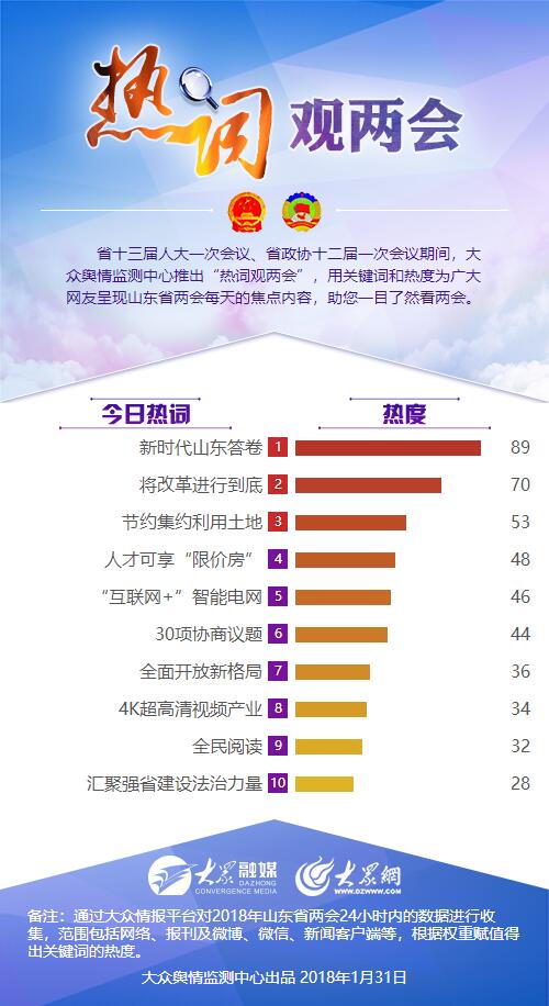 編者按:省十三屆人大一次會議、省政協(xié)十二屆一次會議期間,大眾輿情監(jiān)測中心推出“熱詞觀兩會”,用關(guān)鍵詞和熱度為廣大網(wǎng)友呈現(xiàn)山東省兩會每天的焦點內(nèi)容,助您一目了然看兩會。