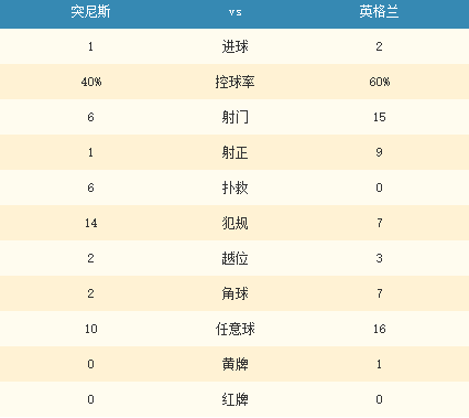 第78分鐘,英格蘭獲得罰球弧頂?shù)娜我馇颍⑹怖?揚主罰射門打高。第91分鐘,特里皮爾開出右側(cè)角球,馬奎爾頭球擺渡,無人防守的凱恩左肋5碼處頭球破門。最終,英格蘭2-1突尼斯。