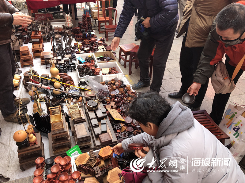 其實(shí)英雄山文化市場最有特色的,還數(shù)它的地?cái)偽幕。每逢?jié)假日,四五百家地?cái)偡至性谑袌鰞蓚?cè),根雕木雕、工藝擺件、珠寶玉石等應(yīng)用僅有。早在26日,記者就曾來感受過這場接地氣的文化盛宴。