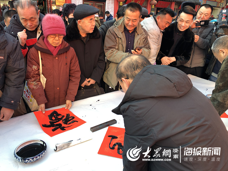 英雄山文化市場準(zhǔn)備了豐富多彩的民俗活動(dòng)回饋市民,十幾名書法家為市民免費(fèi)寫福字和春聯(lián)