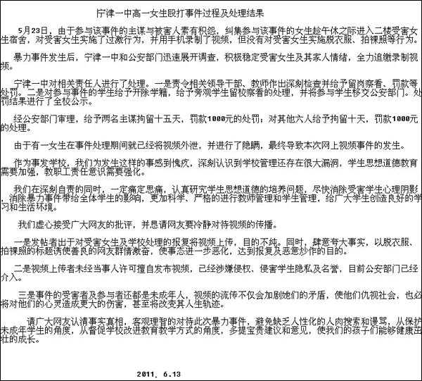 13日晚10左右,有網(wǎng)友在名為“寧津縣第一中學(xué)”的QQ空間以及寧津貼吧等相關(guān)網(wǎng)頁(yè),公布了關(guān)于寧津一中高一女生毆打事件過(guò)程及處理結(jié)果。該帖子說(shuō),參與事件的主謀與被害女生素有積怨,暴力事件發(fā)生后,學(xué)校對(duì)參與事件的學(xué)生給予開除學(xué)籍,對(duì)旁觀學(xué)生給予留校察看的處理,并將參與學(xué)生移交公安部門。該帖子說(shuō),經(jīng)公安部門審理,給予兩名主謀拘留15天,罰款1000元的處罰;對(duì)其他六人給予拘留10天,罰款1000元的處理。