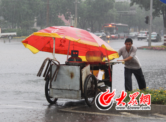 今天中午,市民劉先生相約和同事出門吃午飯,卻發(fā)現豆大的雨點從天而降,即便開著汽車開啟雨刷,但能見度依然很低。在歷山路、濼源大街上很多車輛打開應急燈緩慢通行,沿街攤點冒雨收攤。
